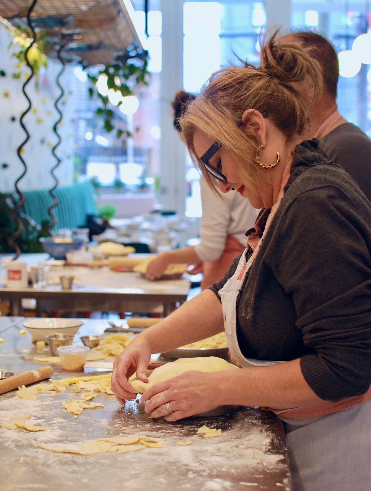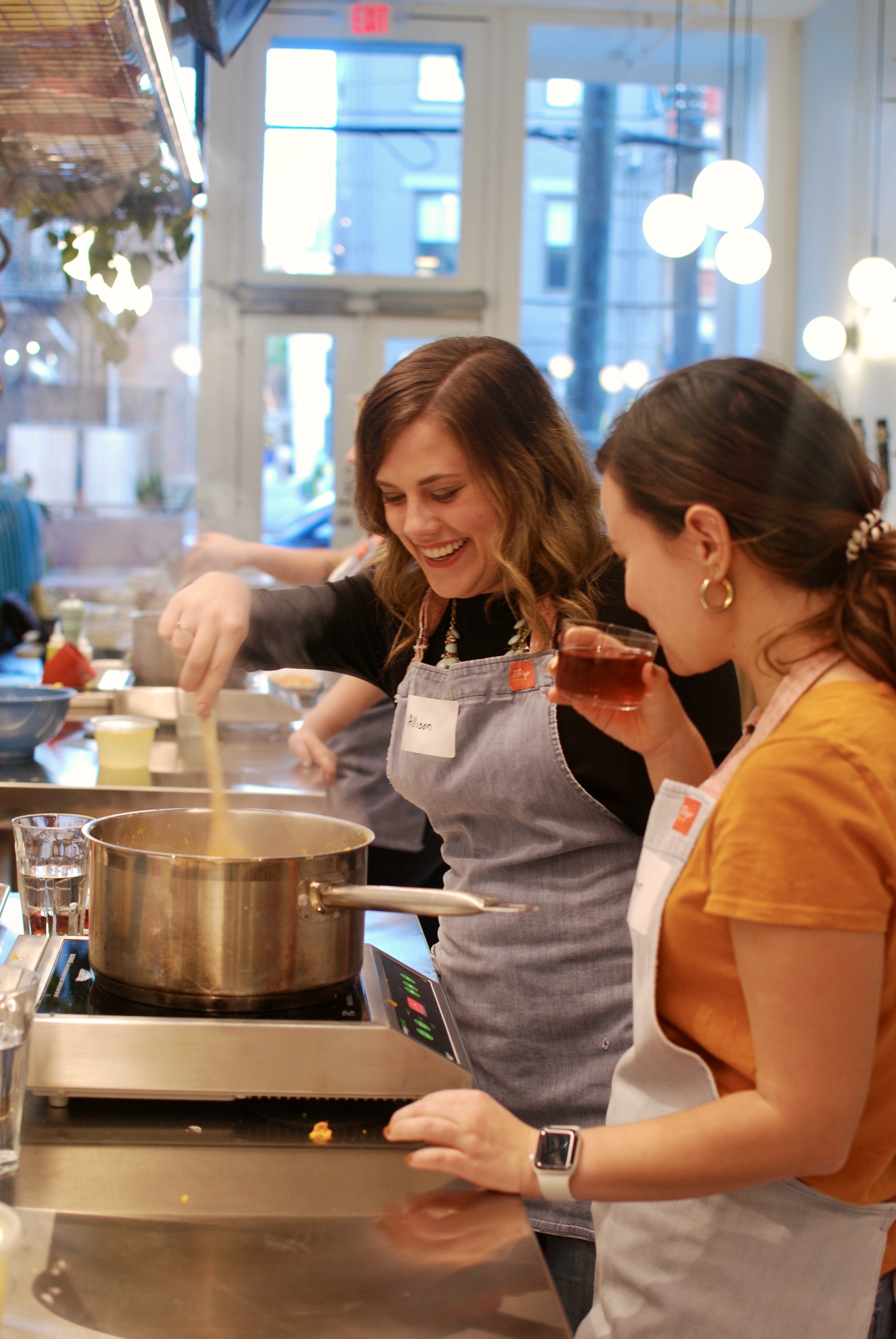 You’ll follow along with our chef instructor to make a menu or baked good from start to finish. Click here to learn more about pricing and ticket structure. We prepare each cooking station with pre-measured ingredients and essential equipment. Above your station is a TV monitor displaying a birds eye view of the chef-instructor's station. You'll cook along with our chef-instructor, who will also walk around to provide one-on-one guidance as needed. Our classes are fully staffed with a bartender to bring you tasty drinks, and assistants to keep your station tidy. The best part? We'll do all the dishes! When all the cooking is finished, you’ll sit down in our dining and bar area to enjoy what you’ve made. If you’re in a baking/pastry class (for example, Holiday Pies) you’ll leave with a finished baked good to take home!
